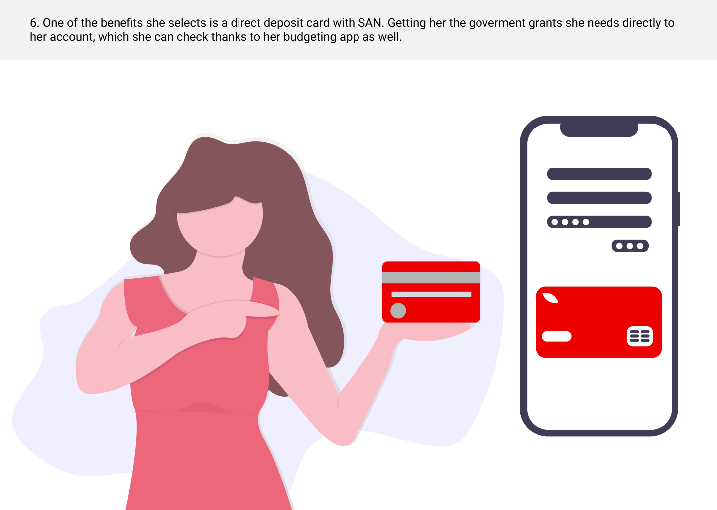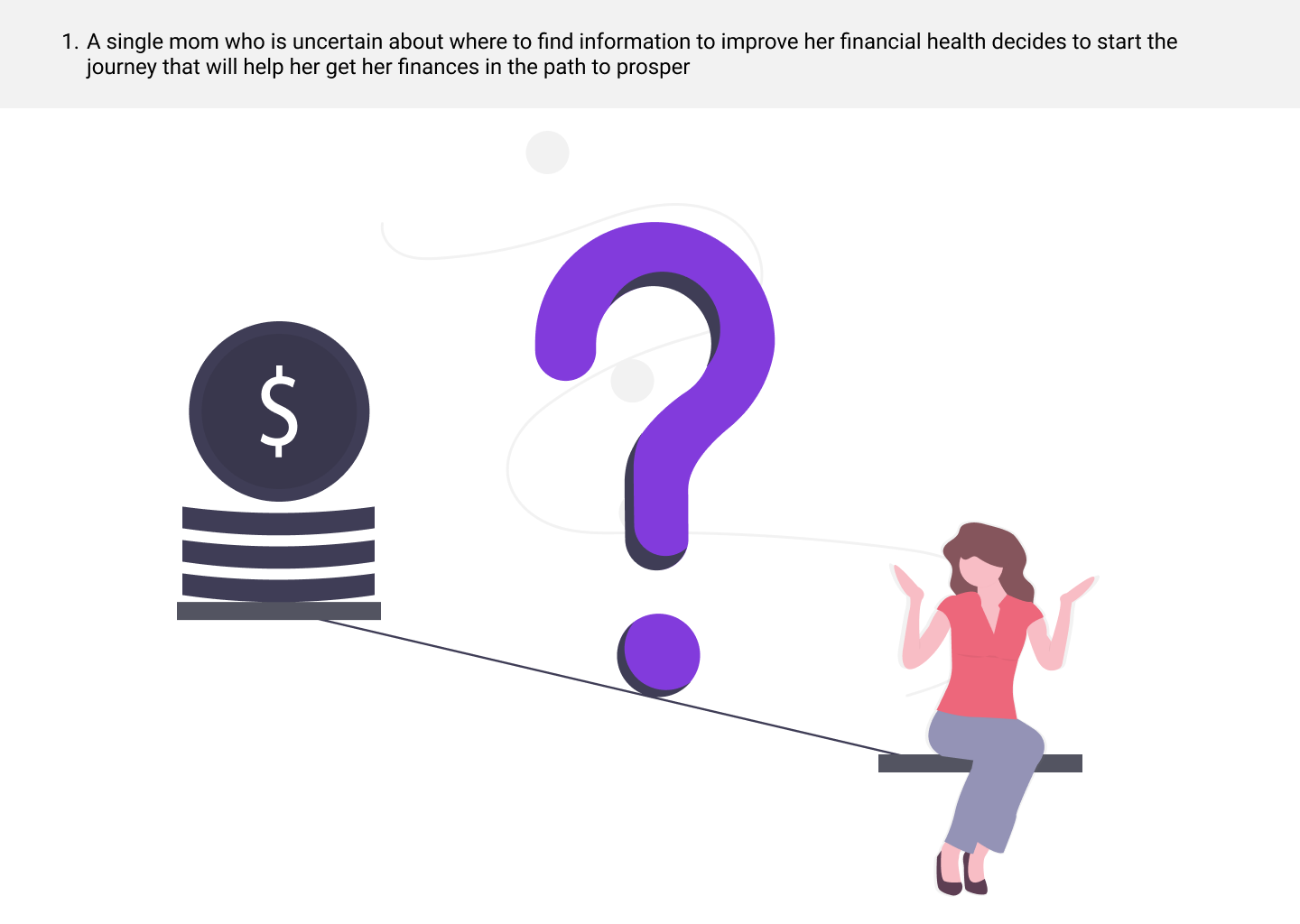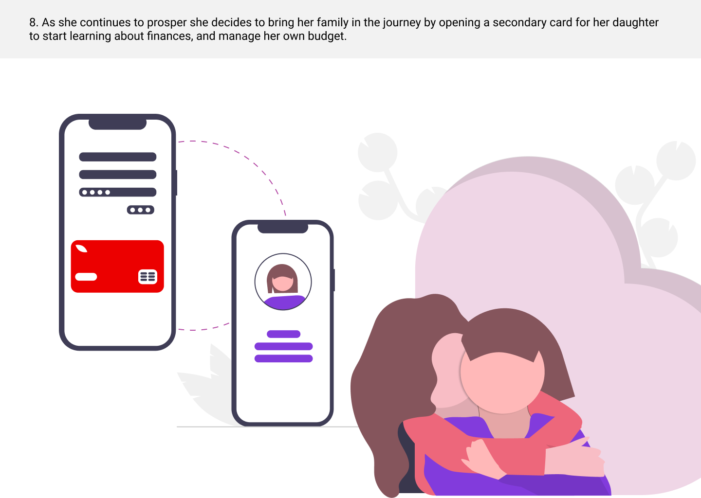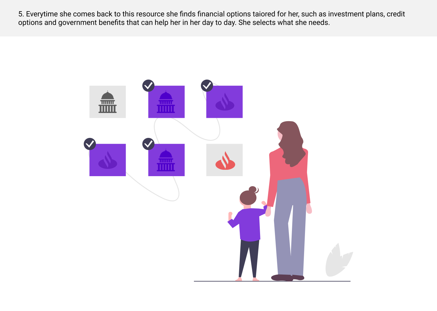 Once we had this results, I decided to create a storyboard to exemplify the journey a single mother could follow, and explain our stakeholders where we could see the benefit of the use of this new product in driving customer growth and product adoption.