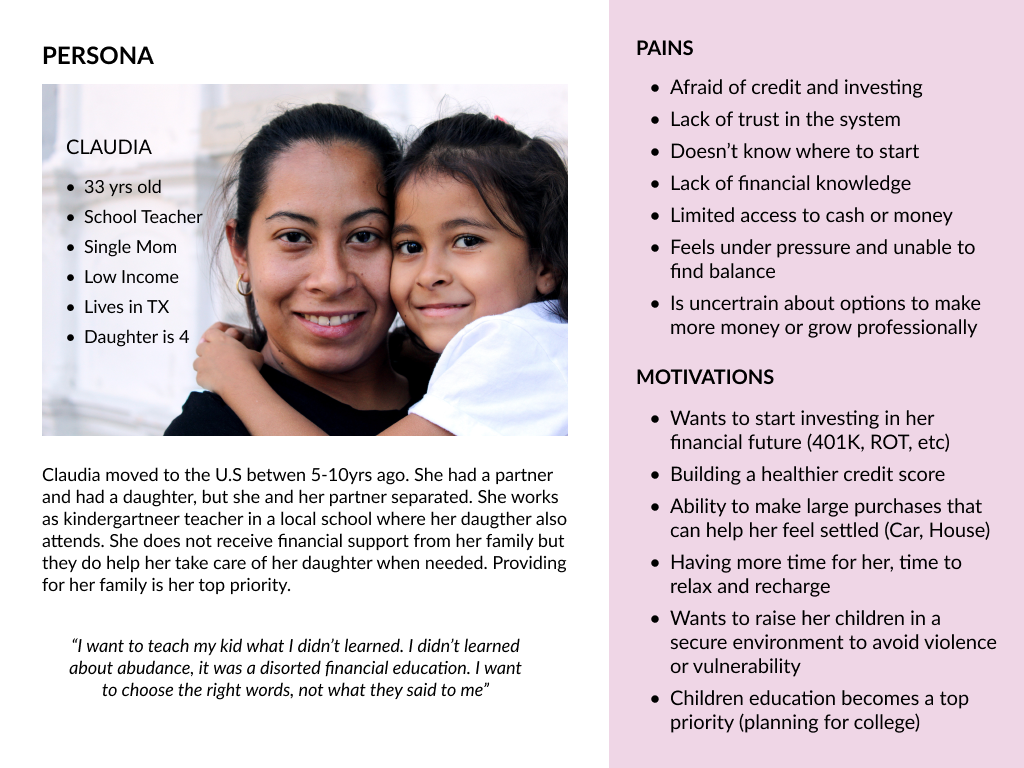 With this in mind we seat out to understand the young hispanics, specifically the first and second generation aged between 18-38 years old. Inside this group we found that Single Hispanic Mothers often suffer from more problems as sole household heads and in many situations they are not a priority for the current financial tools. We want to change that.