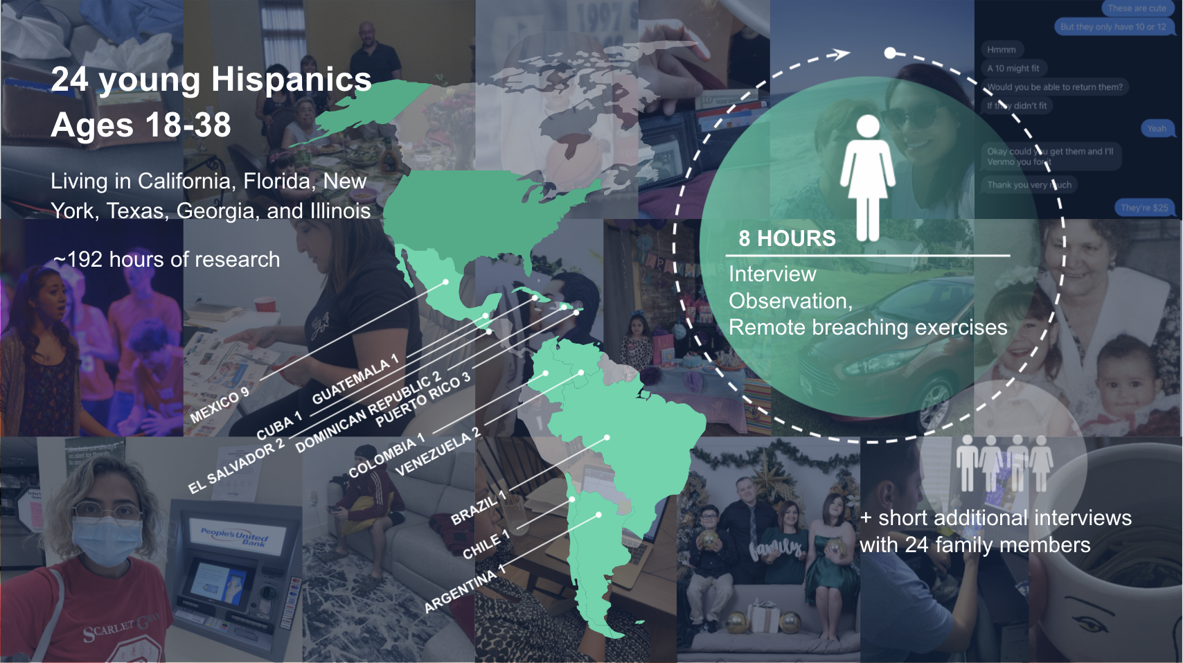 The Ethnographic Research had a duration of more than 190 hours, and it included 24 participant ages 18-38 and in some cases their family members. This we conducted in partnership with RED Associated and focused on behavioral economics.