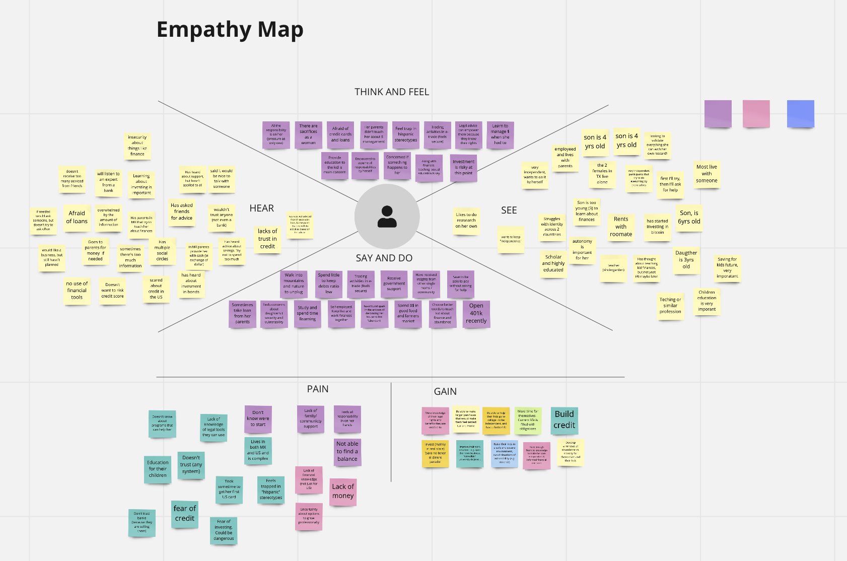 For analyzing the interviews information I use the method of building an empathy map where I focused on the "think and feel", and "say/do" spaces to understand clearly what could be their motivations and main pain problems.