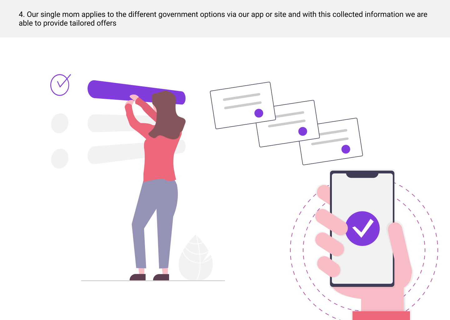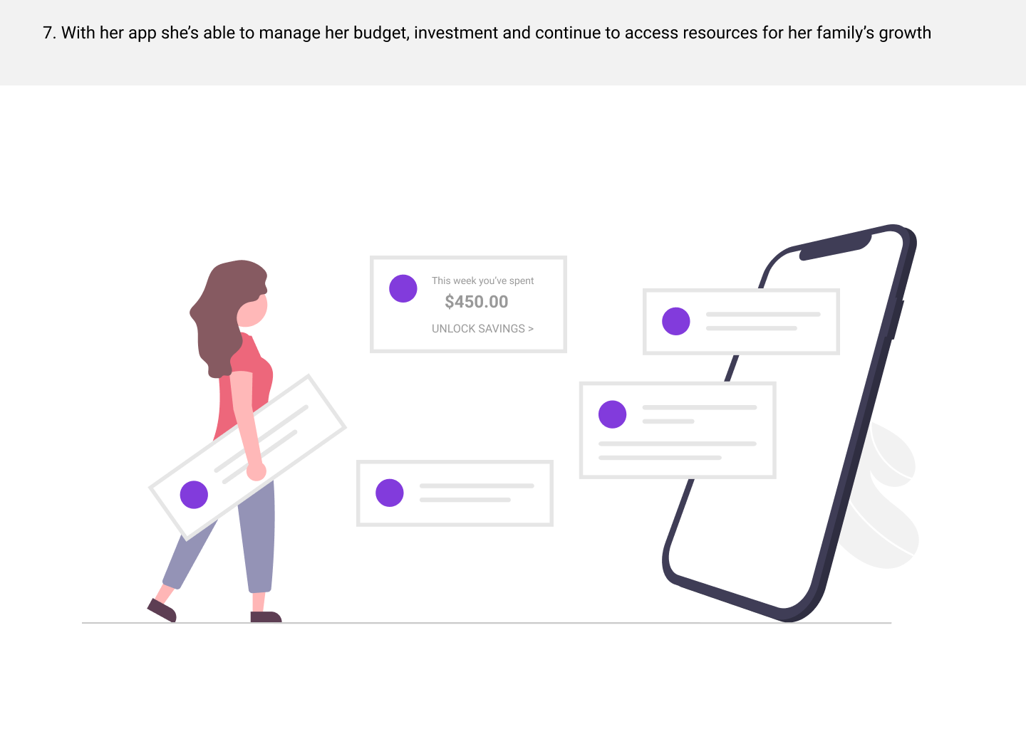 In these 8 frames it’s explained how a mother discovers our application, how they can sign in, onboard and start using the solution. Once they see the benefits we expect the single mothers will bring their families on-board as well.